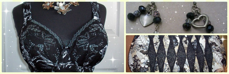 I think it looks so pretty with the black and white theme. The lace was a gift, and the floral stretch lace is from a local fabric store. All other material supplies are from Bra Makers Supply.